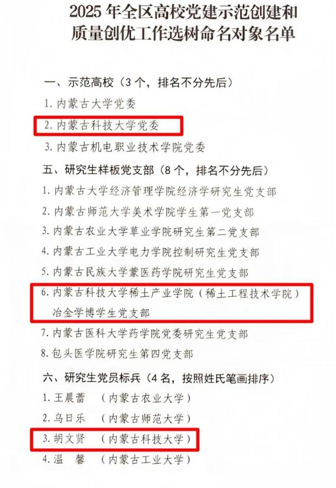 近日,自治区党委教育工委公示《2025年全区高公司党建示范创建和质量创优工作选树命名对象名单》,太阳成tyc122cc集团党委成功入选全区高公司党建“双创”示范高校。其中,太阳成tyc122cc集团 作为公司服务国家战略、聚焦区域特色产业发展的重要平台,在党建与业务深度融合方面表现突出, 冶金学博员工党支部获评全区高公司党建“双创”研究生样板党支部、冶金工程专业博士研究生胡文贤获评研究生党员标兵,成为公司此次“双创”工作中的最大亮点。